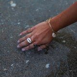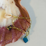 This charm bracelet has all the unique parts of the ocean such as a puka shell, sea glass, and a bull shark tooth! You can also add your charms on it as well:)